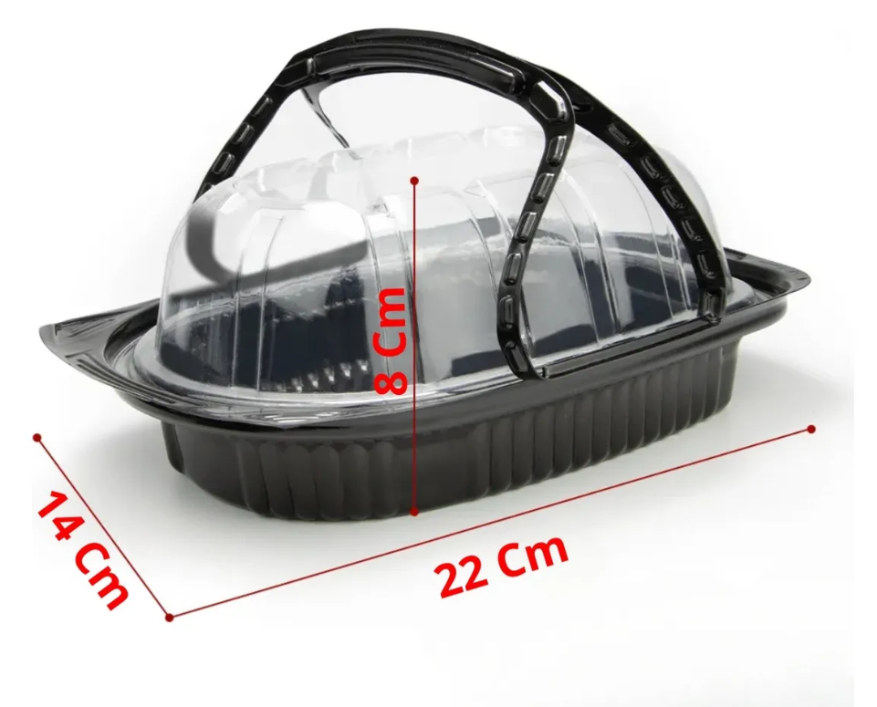 Envase térmico para pollo asado con base negra resistente, tapa transparente abovedada y asa integrada para transporte seguro. Conserva el calor, evita derrames y muestra el producto con claridad. Ideal para delivery, rotiserías y locales de comida.