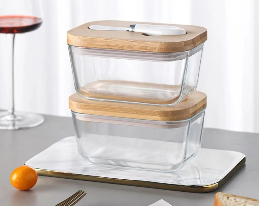Mantequillero de vidrio con tapa de bambú ajustada y cuchillo de acero inoxidable. Capacidad de 600 ml, ideal para conservar la mantequilla fresca y lista para servir. Elegante, funcional y resistente, perfecto para dar un toque moderno a tu cocina.