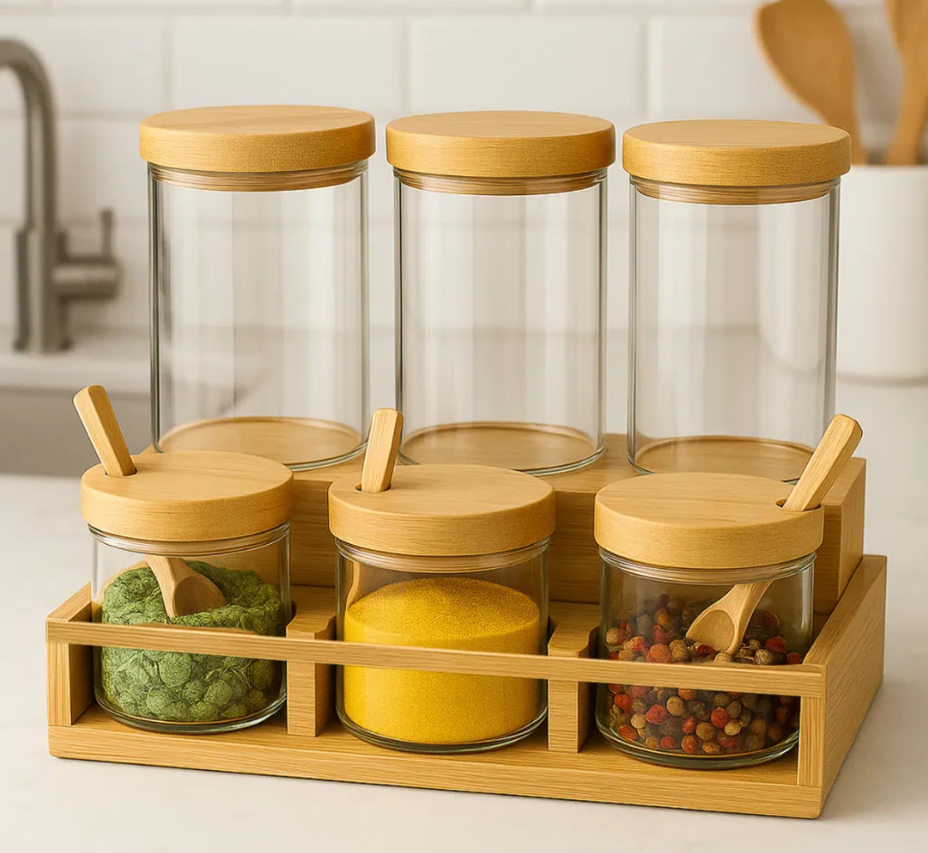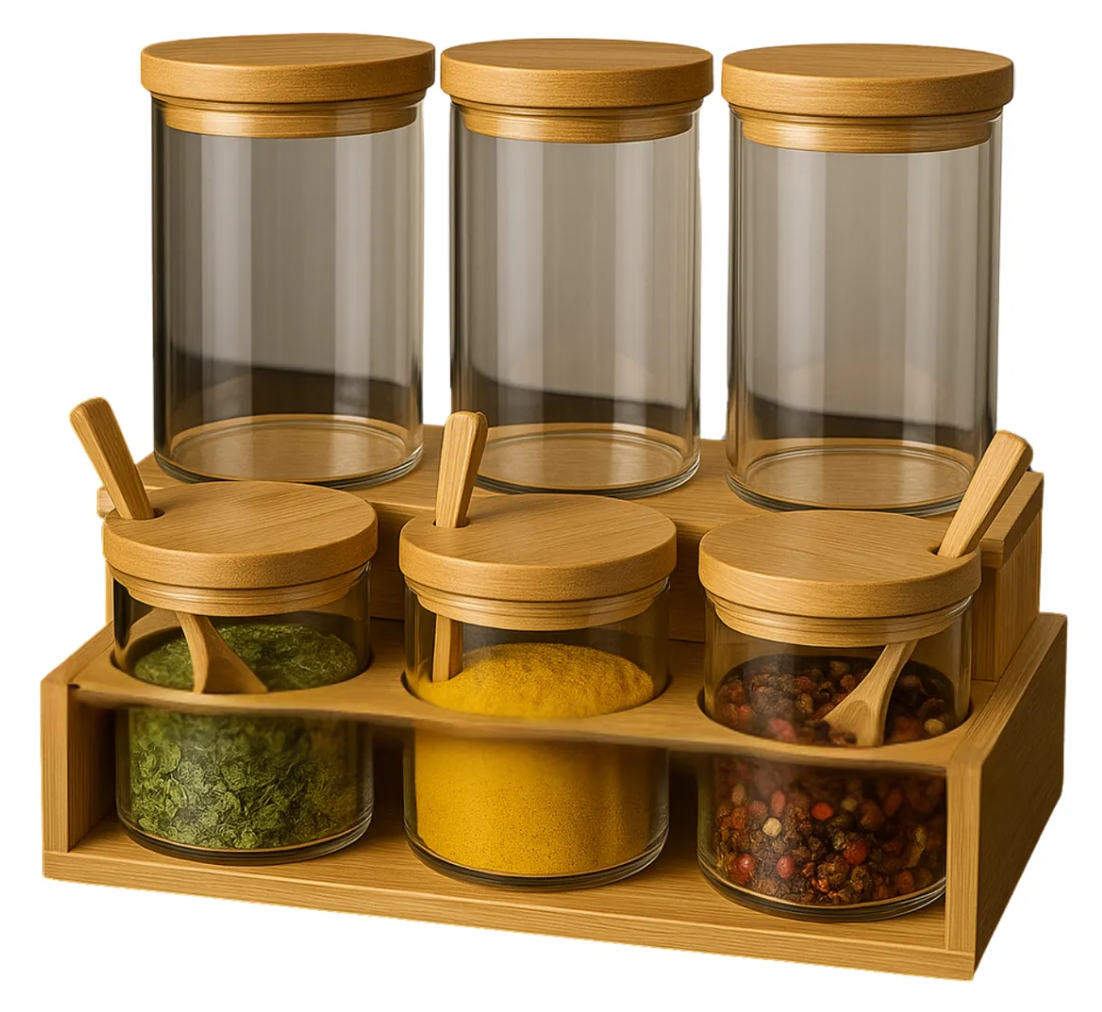 Set de 6 frascos especieros de vidrio con tapas y cucharitas de bambú, organizados en base