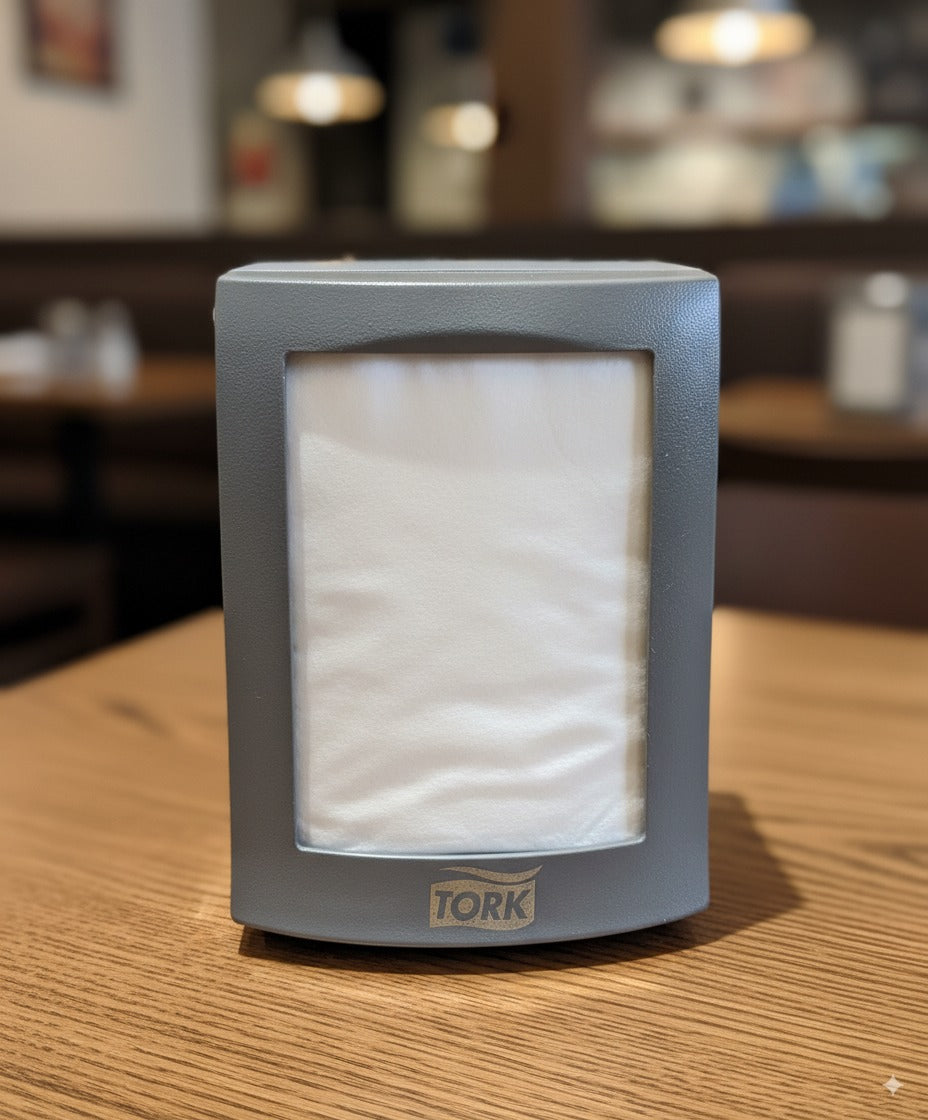 Dispensador de servilletas de la marca Tork, hecho de plástico gris oscuro. Tiene una forma rectangular con bordes ligeramente curvados. En la parte frontal cuenta con una ventana translúcida que permite ver el nivel de servilletas que quedan dentro. Está diseñado para uso en lugares de comida rápida o restaurantes, facilitando el acceso rápido y limpio a las servilletas