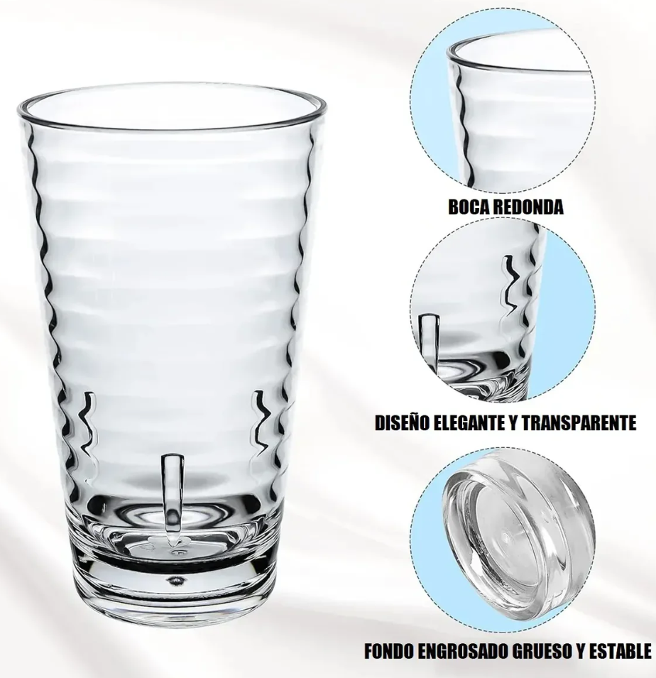 Vasos acrílicos transparentes tipo cristal, resistentes a golpes y perfectos para uso diario. Ideales para bebidas frías en interiores o exteriores. Son apilables, livianos y están disponibles en distintas medidas para adaptarse a tus necesidades.